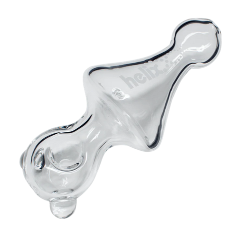 The mini Helix™ Hand Pipe is 5.5" long and made on 25mm tubing. The familiar spoon head is fused to a Venturi chamber mouthpiece, featuring three air intake holes that cool and spin smoke. Two feet stabilize the piece between uses. The Helix™ design both filters smoke and conserves plant matter. No accessories or water are necessary for using this hand pipe.