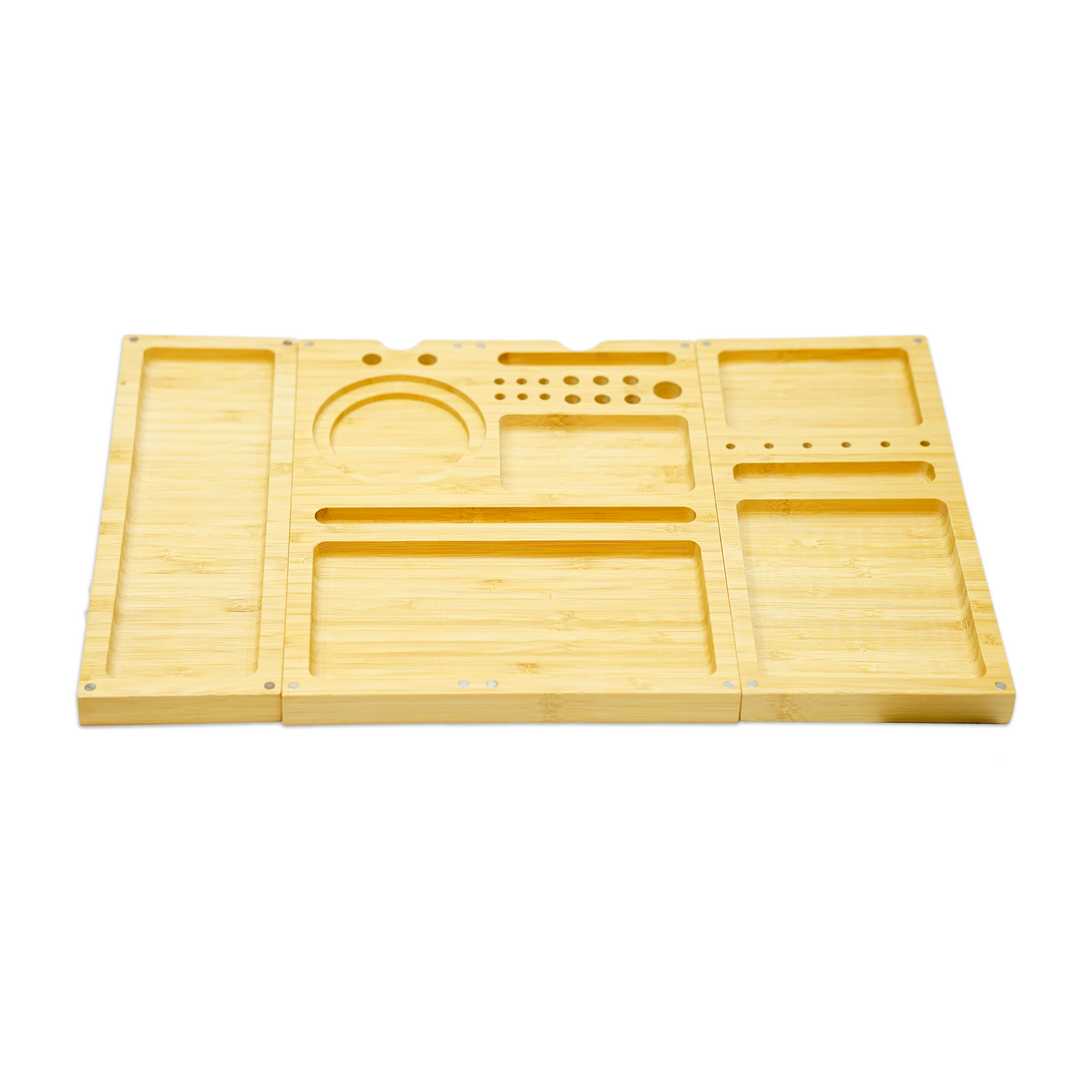 What's better than two trays? Three rolling trays! All the right sized slots in all the right places. The Medic Triple Bamboo Tray has super strong magnets that fix in place securely when in use or when packed up. The beautifully tooled bamboo is a wonderful surface to roll on. You'll find a convenient home for all your tools, papers and plenty of space to roll on.