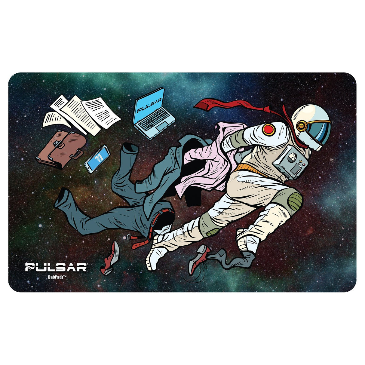 The DabPadz Fabric Top - Super Spaceman mat is a padded water pipe-protecting cushion with a screen-printed fabric top depicting an every day Joe transforming into an heroic spaceman. Made from shock-absorbent rubber, this pad gently rests any precious dab rig or water pipe.